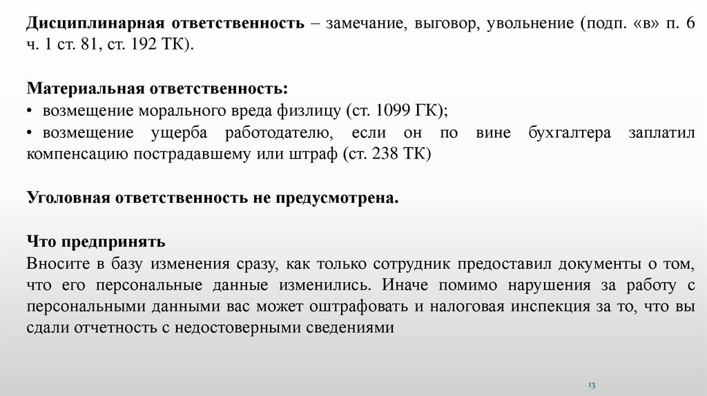 Дисциплинарная ответственность – замечание, выговор, увольнение(подп. «в» п. 6 ч. 1 ст. 81, ст. 192 ТК РФ).