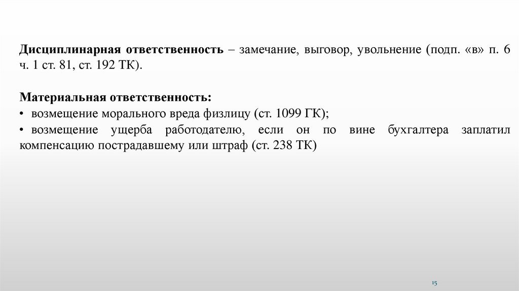 Дисциплинарная ответственность – замечание, выговор, увольнение (подп. «в» п. 6