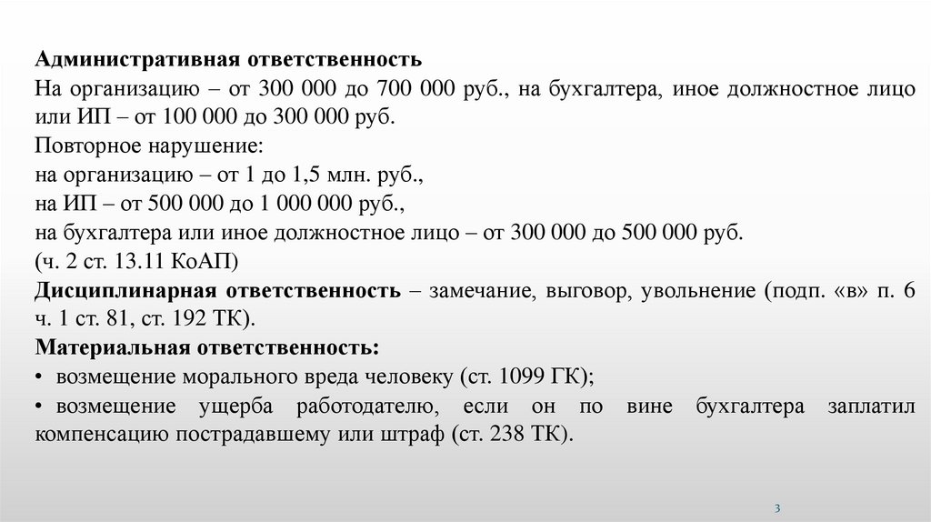 Административная ответственностьНа организацию – от 300 000 до 700 000 руб., на бухгалтера, иное должностное лицо