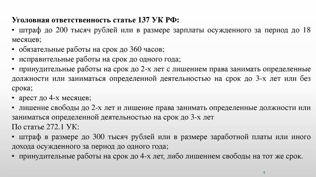 Уголовная ответственность по статье 137 УК РФ:• штраф до 200 тысяч рублей или в размере зарплаты осужденного за период до 18