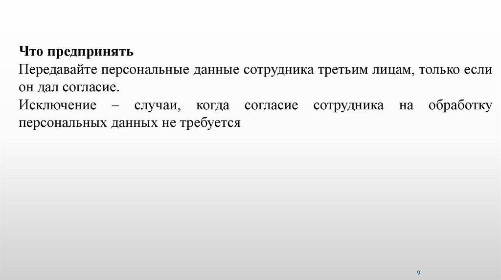 Что предпринятьПередавайте персональные данные сотрудника третьим лицам, только если