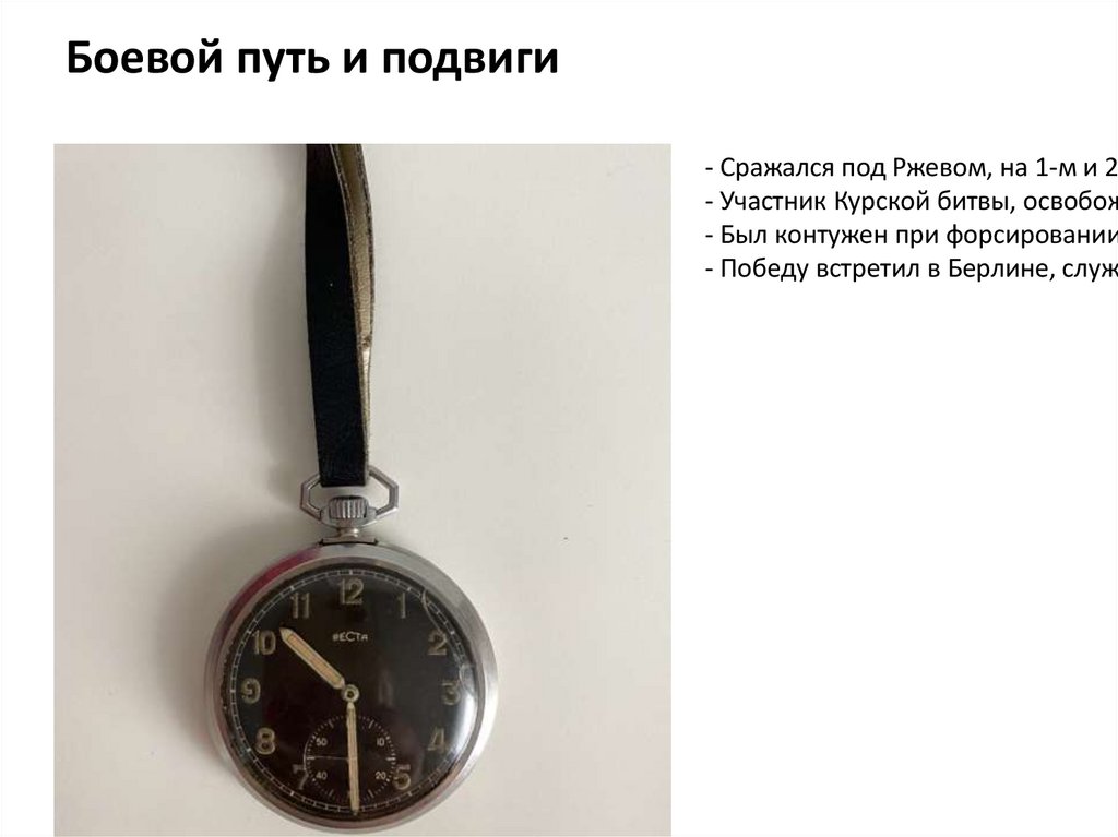 Боевой путь и подвиги- Сражался под Ржевом, на 1-м и 2- Участник Курской битвы, освобож
