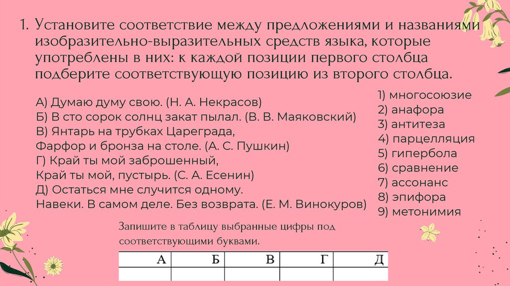 1. Установите соответствие между предложениями и названиямиизобразительно-выразительных средств языка, которые