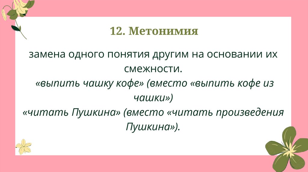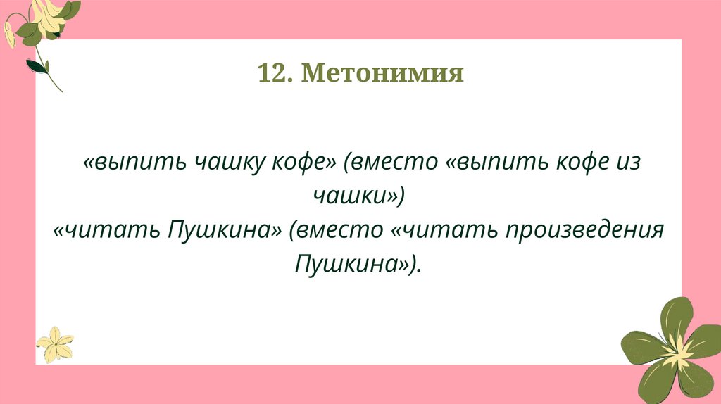 12. Метонимия«выпить чашку кофе» (вместо «выпить кофе из