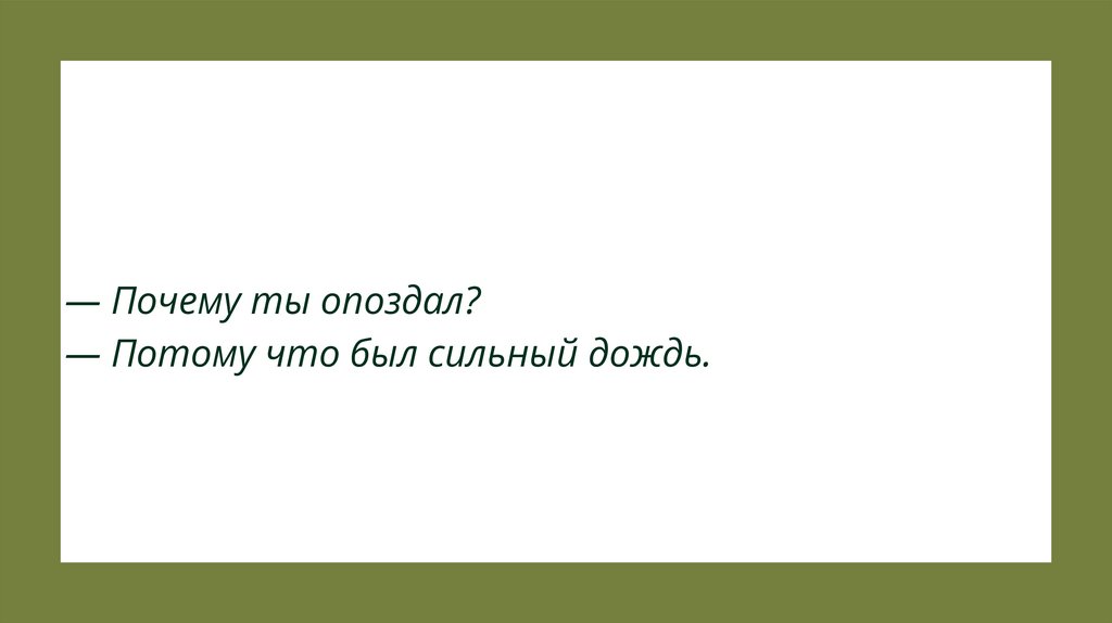 — Почему ты опоздал?— Потому что был сильный дождь.