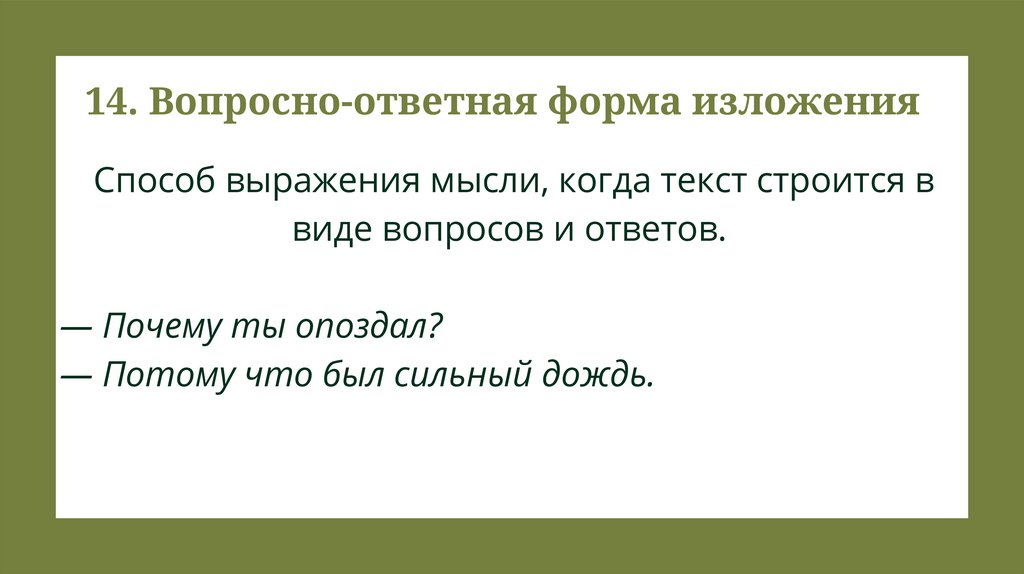 14. Вопросно-ответная форма изложенияСпособ выражения мысли, когда текст строится в