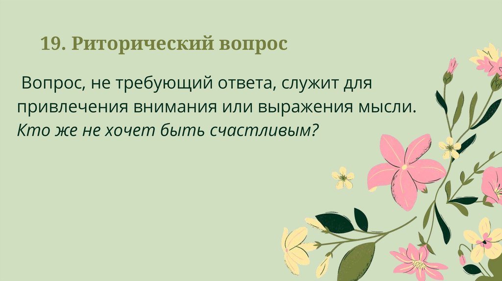 19. Риторический вопросВопрос, не требующий ответа, служит для