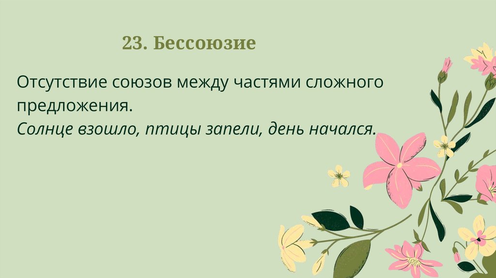 23. БессоюзиеОтсутствие союзов между частями сложного
