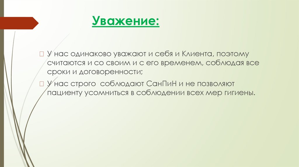 Уважение:У нас одинаково уважают и себя и Клиента, поэтому