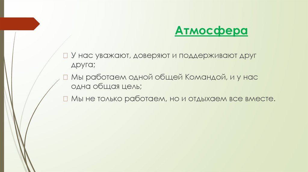 АтмосфераУ нас уважают, доверяют и поддерживают друг