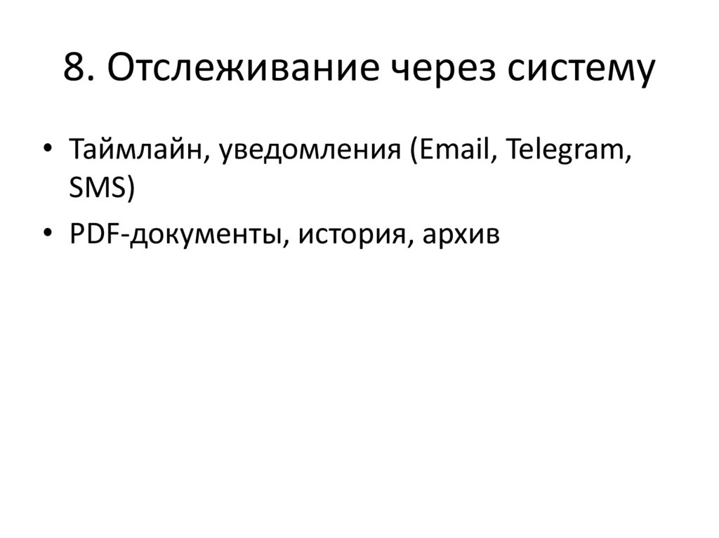 8. Отслеживание через систему• Таймлайн, уведомления (Email, Telegram,