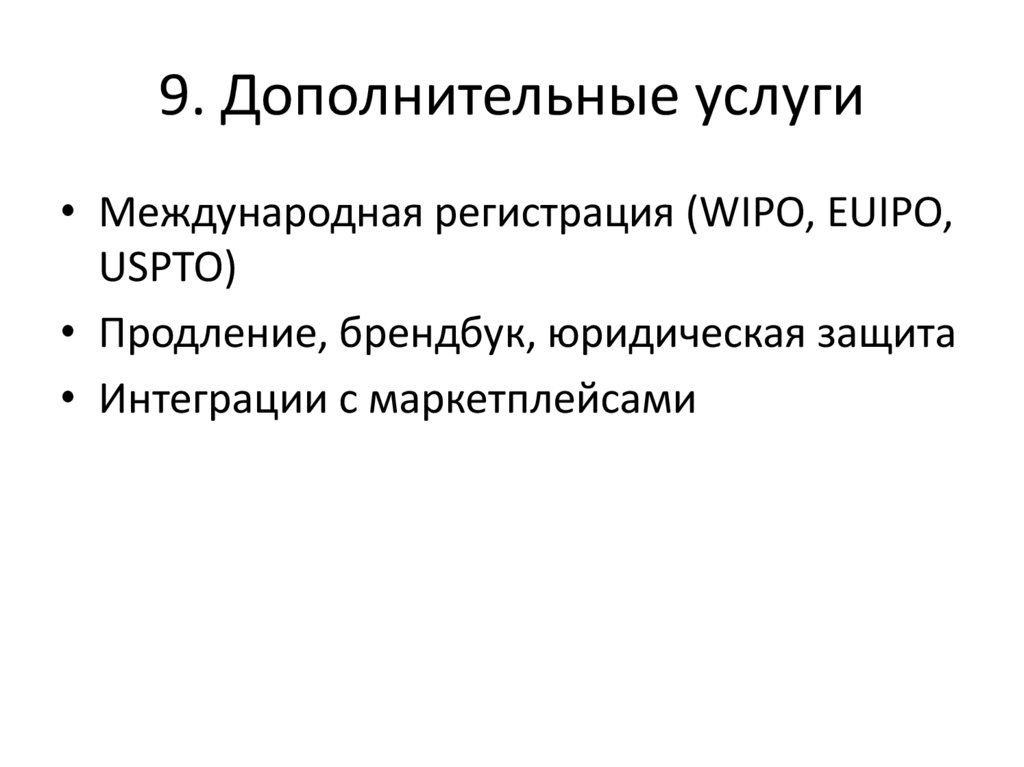 9. Дополнительные услуги• Международная регистрация (WIPO, EUIPO,