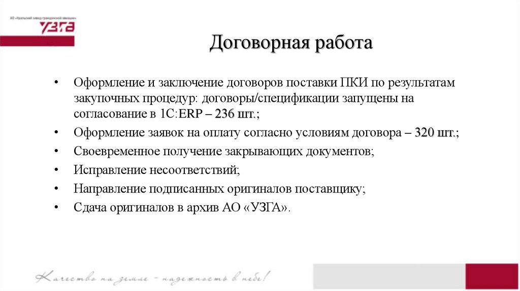 закрывающих документов, исправление несоответствий, направление подписанных оригиналов поставщику, сдача оригиналов в архив АО «УЗГА».