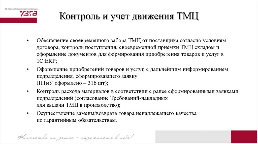 для выдачи ТМЦ в производство). Осуществление замены/возврата товара ненадлежащего качества по гарантийным обязательствам. Своевременная отработка ТА.