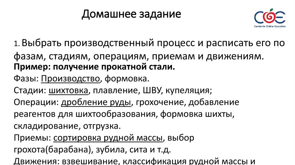 1. Выбрать производственный процесс и расписать его пофазам, стадиям, операциям, приемам и движениям.
