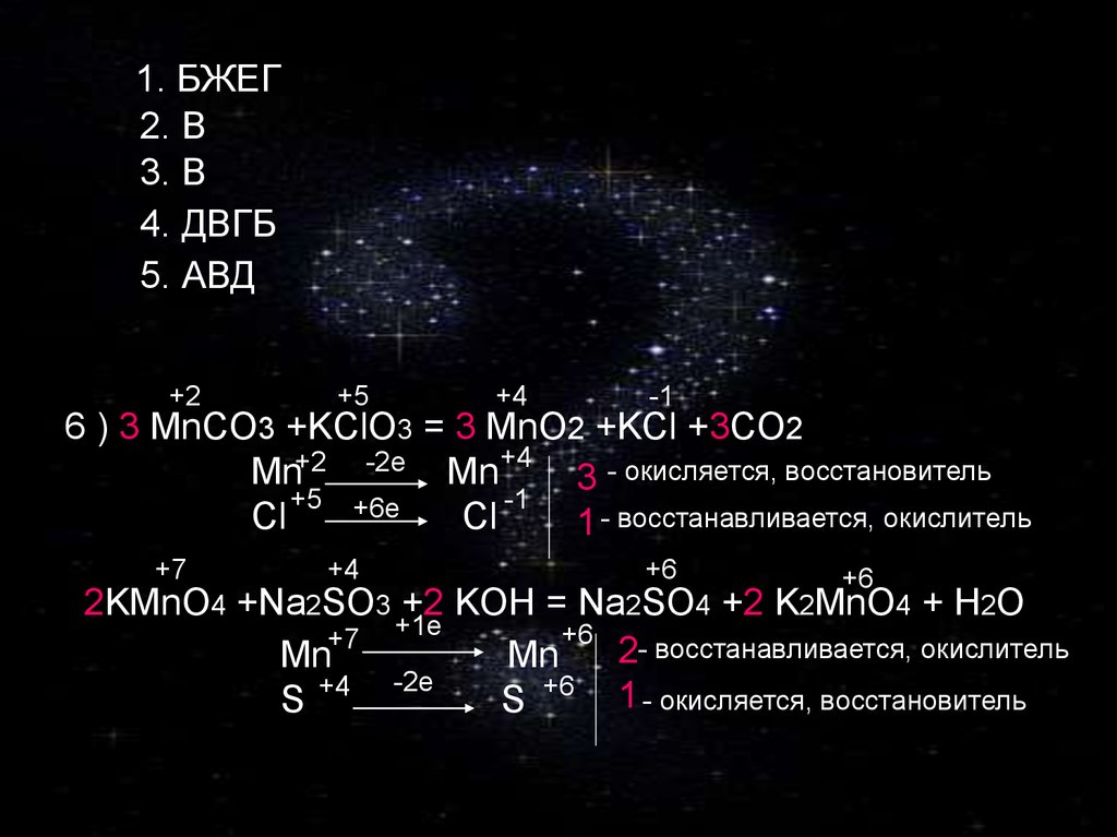 6 ) 3 MnCO3 +KClO3 = 3 MnO2 +KCl +3CO2