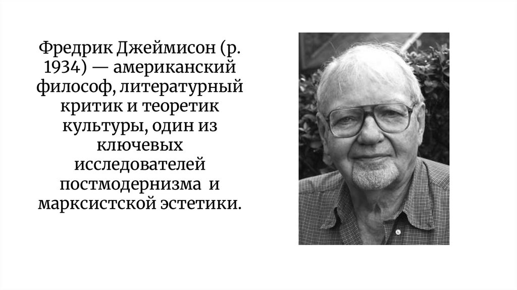 2. Фредрик Джеймисон (р. 1934) — американский философ, литературный критик и теоретик культуры, один из ключевых исследователей