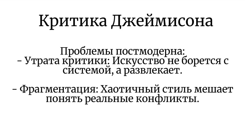 Проблемы постмодерна:- Утрата критики: Искусство не борется с