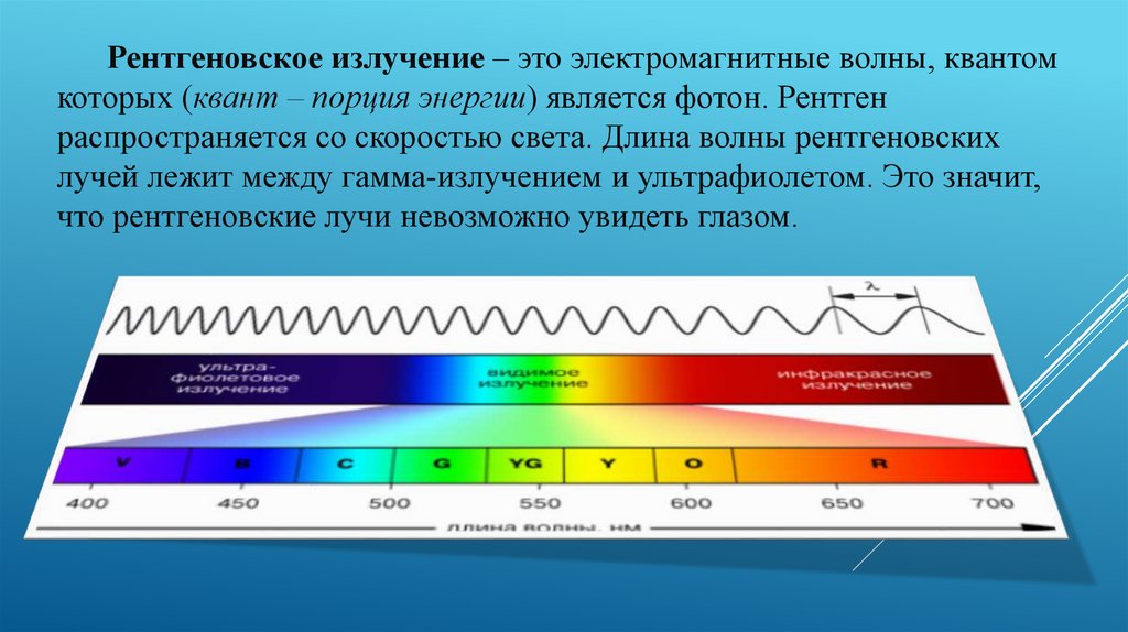 Рентгеновское излучение – это электромагнитные волны, квантомкоторых (квант – порция энергии) является фотон. Рентген