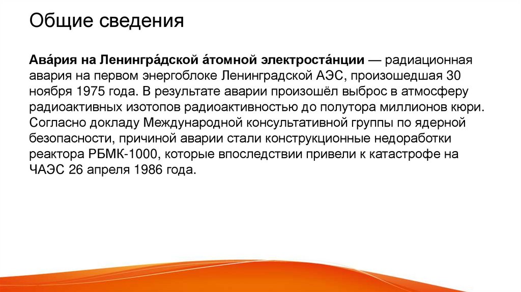 Общие сведенияАва́рия на Ленингра́дской а́томной электроста́нции — радиационная