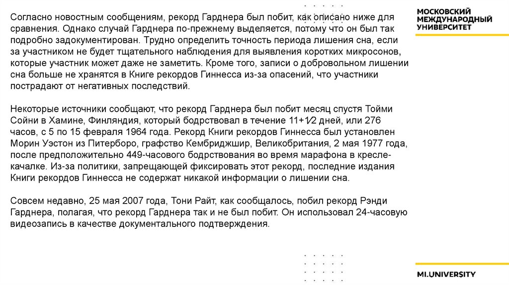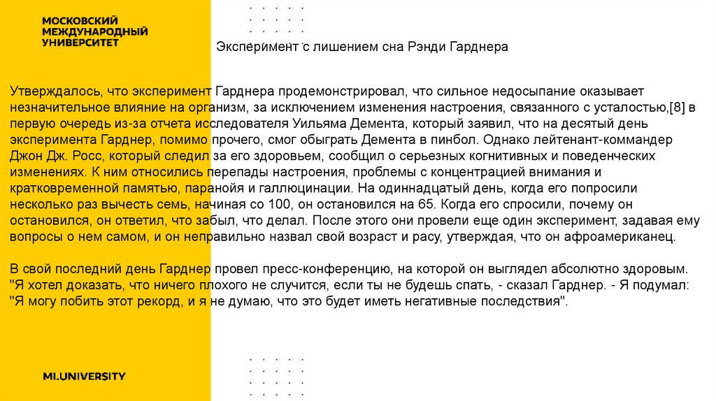 Эксперимент с лишением сна Рэнди ГарднераУтверждалось, что эксперимент Гарднера продемонстрировал, что сильное недосыпание оказывает
