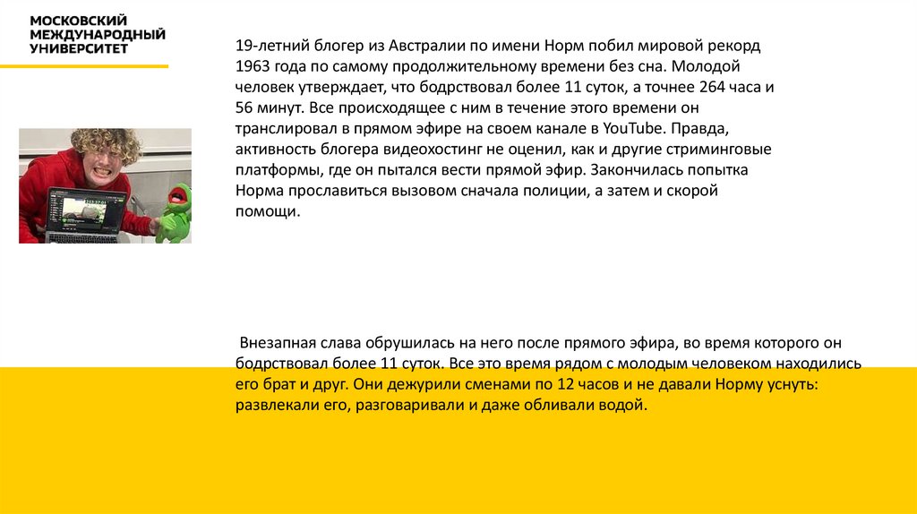 19-летний блогер из Австралии по имени Норм побил мировой рекорд1963 года по самому продолжительному времени без сна. Молодой