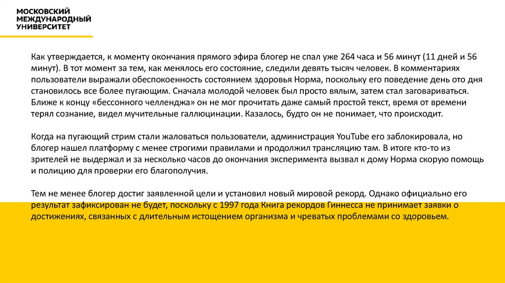 Как утверждается, к моменту окончания прямого эфира блогер не спал уже 264 часа и 56 минут (11 дней и 56минут). В тот момент за тем, как менялось его состояние, следили девять тысяч человек. В комментариях