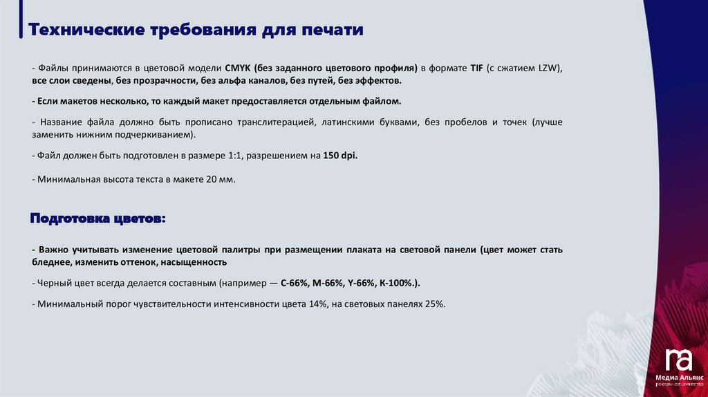 Технические требования для печати- Файлы принимаются в цветовой модели CMYK (без заданного цветового профиля) в формате TIF (с сжатием LZW),
