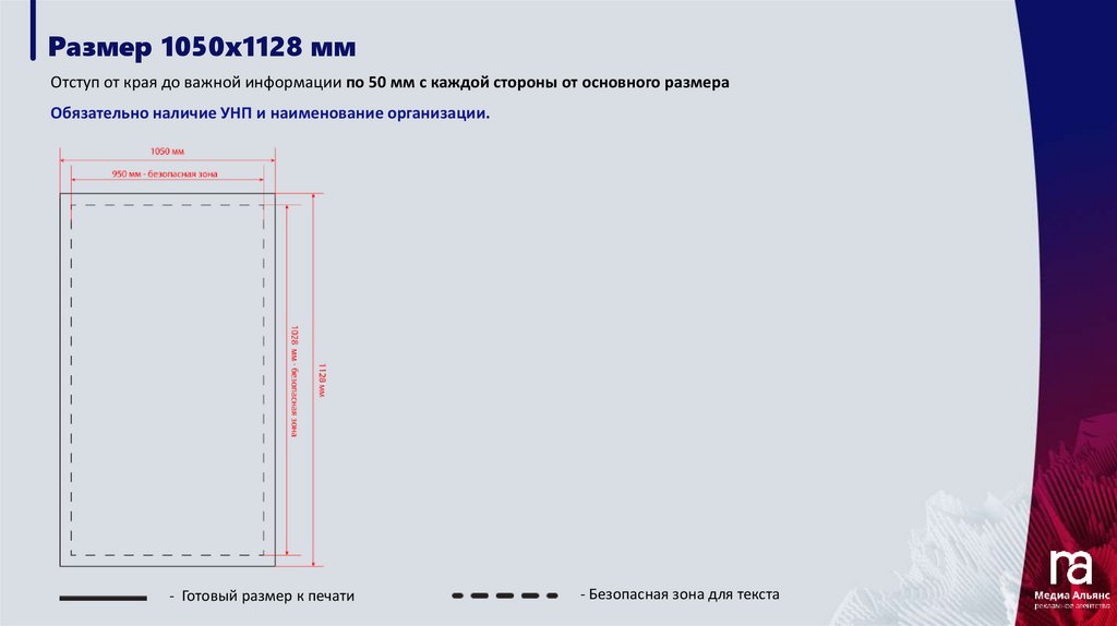 Размер 1050х1128 ммОтступ от края до важной информации по 50 мм с каждой стороны от основного размера