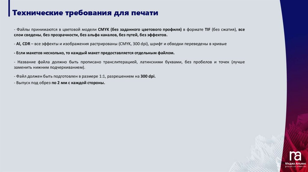 Технические требования для печати- Файлы принимаются в цветовой модели CMYK (без заданного цветового профиля) в формате TIF (без сжатия), все