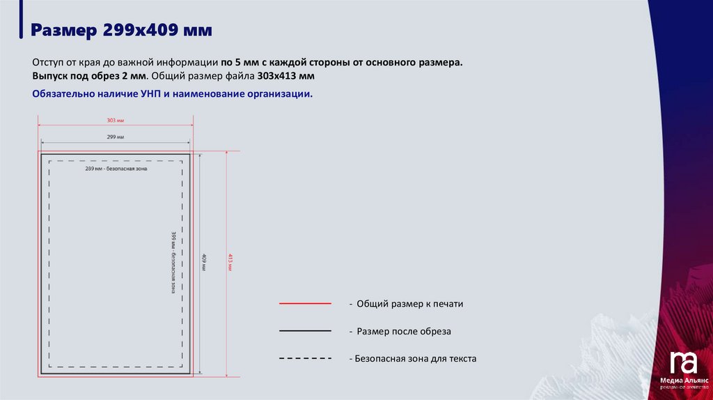 Размер 299х409 ммОтступ от края до важной информации по 5 мм с каждой стороны от основного размера.