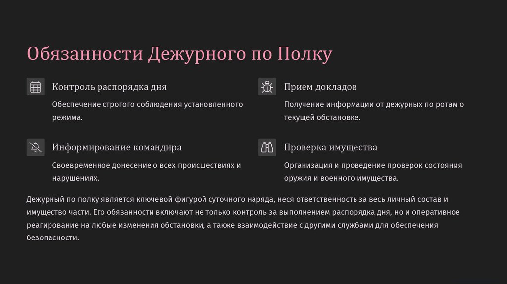 Обязанности Дежурного по ПолкуКонтроль распорядка дня