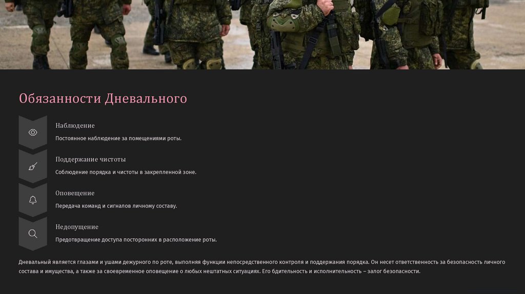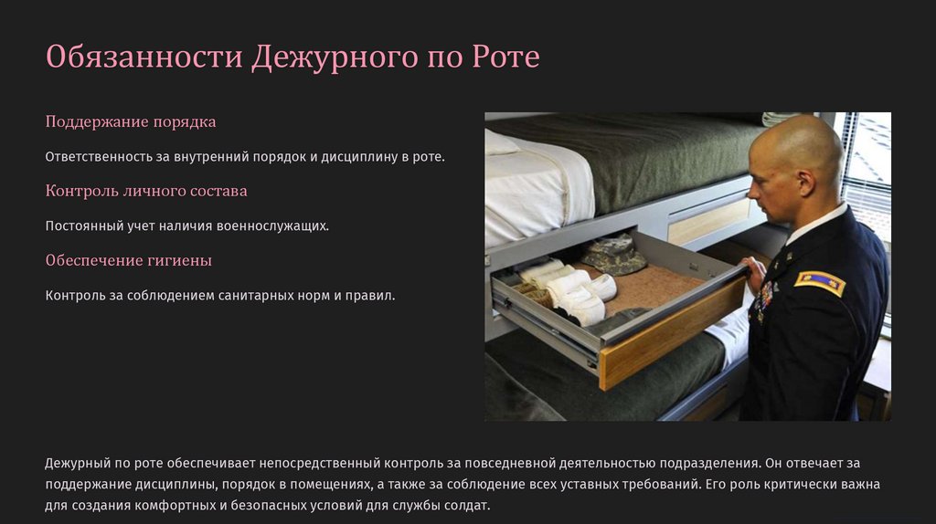 поддержание дисциплины, порядок в помещениях, а также за соблюдение всех уставных требований. Его роль критически важна