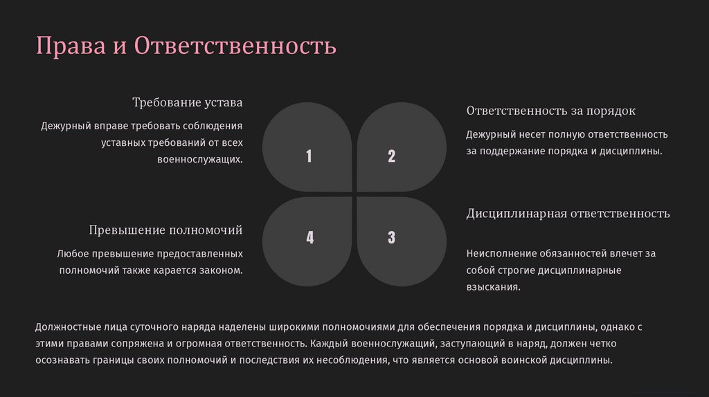 осознавать границы своих полномочий и последствия их несоблюдения, что является основой воинской дисциплины.