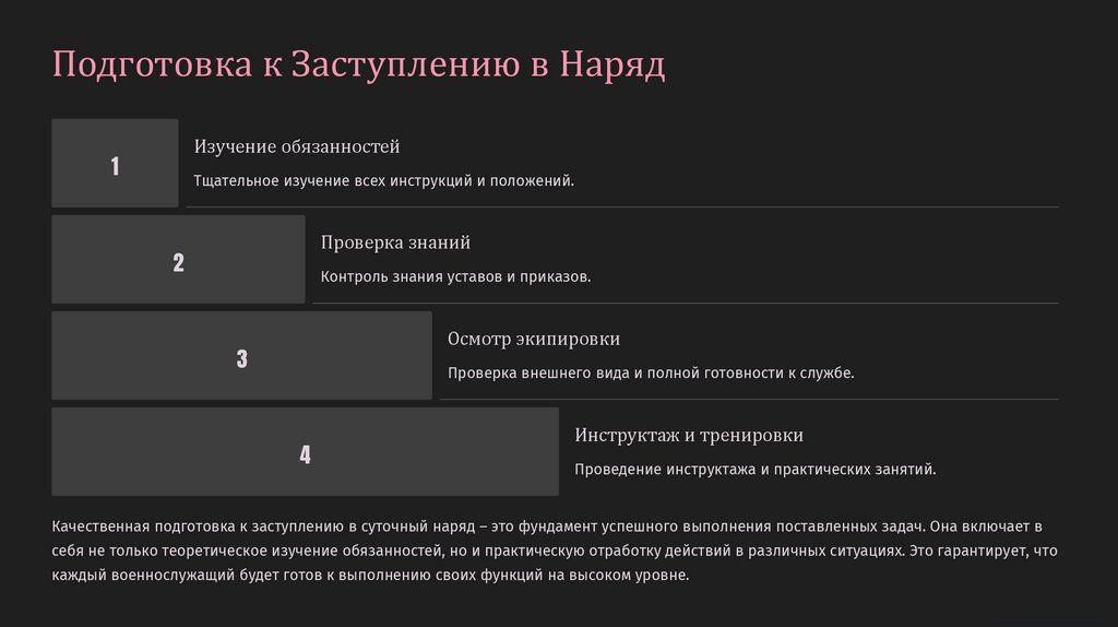 Качественная подготовка к заступлению в суточный наряд – это фундамент успешного выполнения поставленных задач. Она включает в