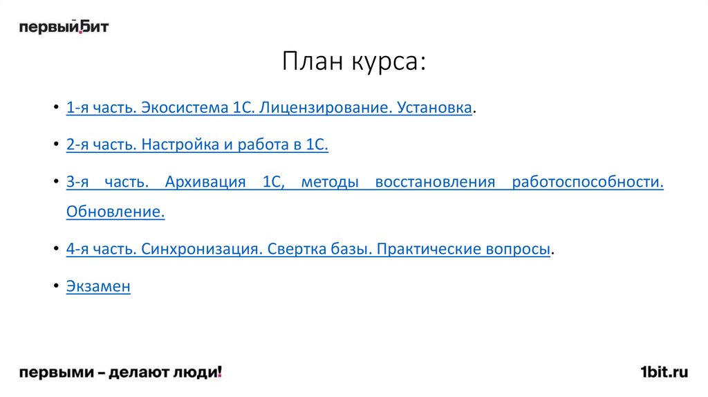 • 1-я часть. Экосистема 1С. Лицензирование. Установка.• 2-я часть. Настройка и работа в 1С.