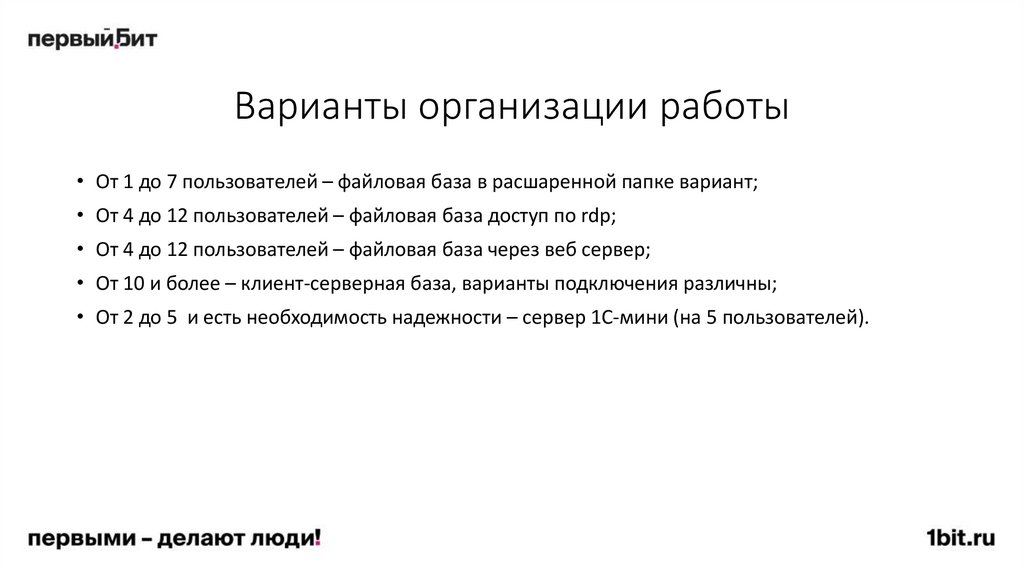 • От 1 до 7 пользователей – файловая база в расшаренной папке вариант;• От 4 до 12 пользователей – файловая база доступ по rdp;