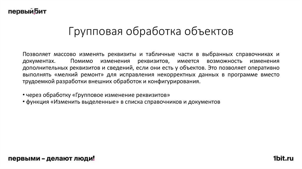 Групповая обработка объектовПозволяет массово изменять реквизиты и табличные части в выбранных справочниках и