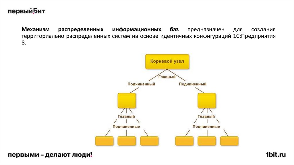 Механизм распределенных информационных баз предназначен для созданиятерриториально распределенных систем на основе идентичных конфигураций 1С:Предприятия