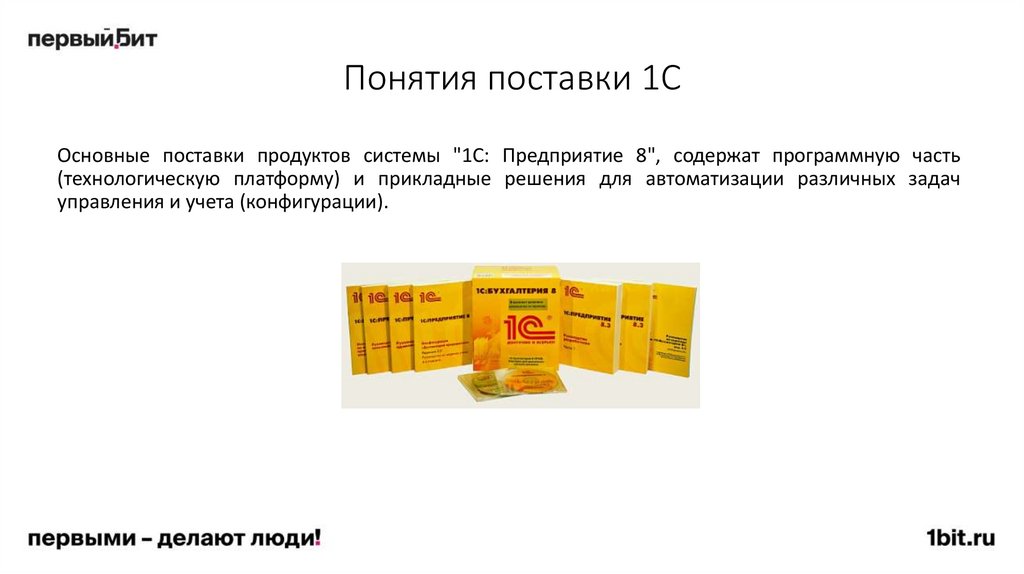 Основные поставки продуктов системы "1С: Предприятие 8", содержат программную часть(технологическую платформу) и прикладные решения для автоматизации различных задач