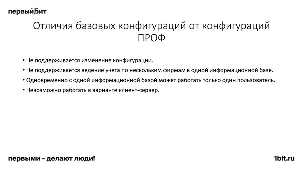 • Не поддерживается изменение конфигурации.• Не поддерживается ведение учета по нескольким фирмам в одной информационной базе.