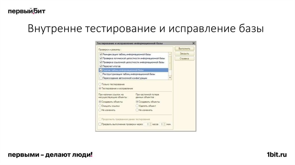 процедура Тестирование и исправление информационных баз, которая запускается в