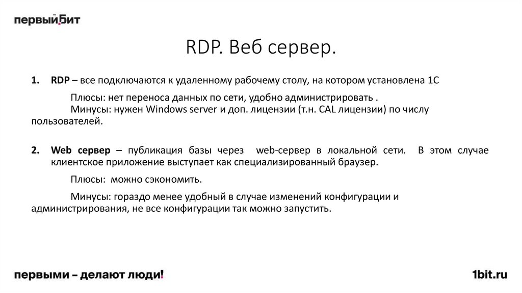 1.RDP – все подключаются к удаленному рабочему столу, на котором установлена 1С