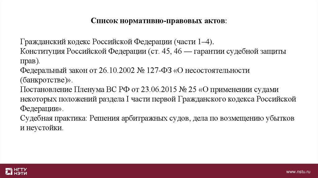 Список нормативно-правовых актов:Гражданский кодекс Российской Федерации (части 1–4).