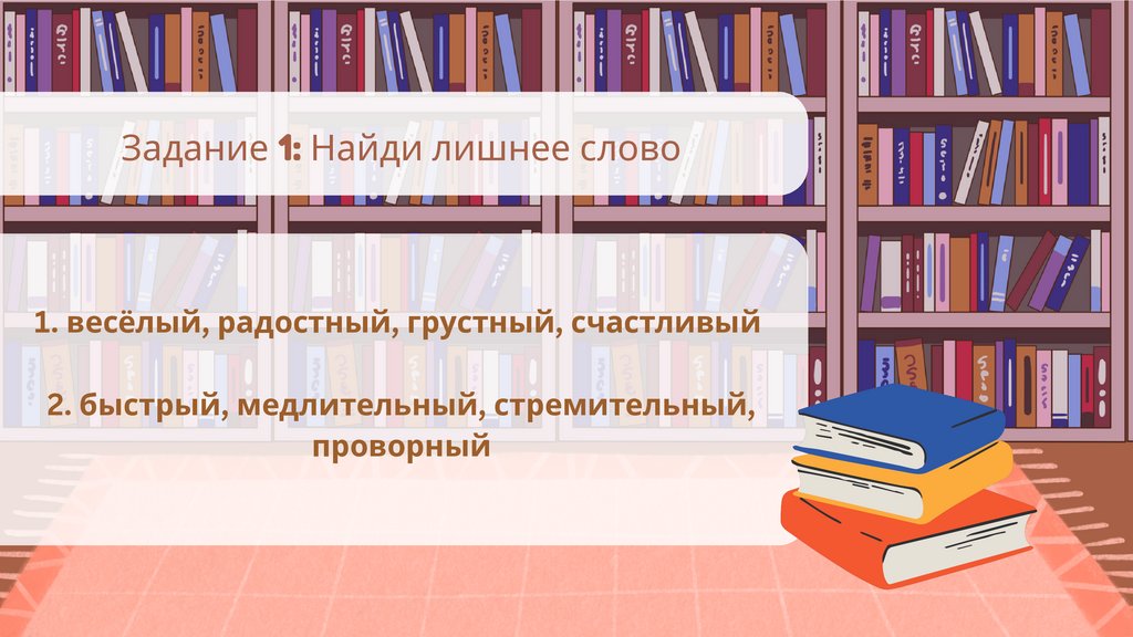 Задание 1: Найди лишнее слово1. весёлый, радостный, грустный, счастливый