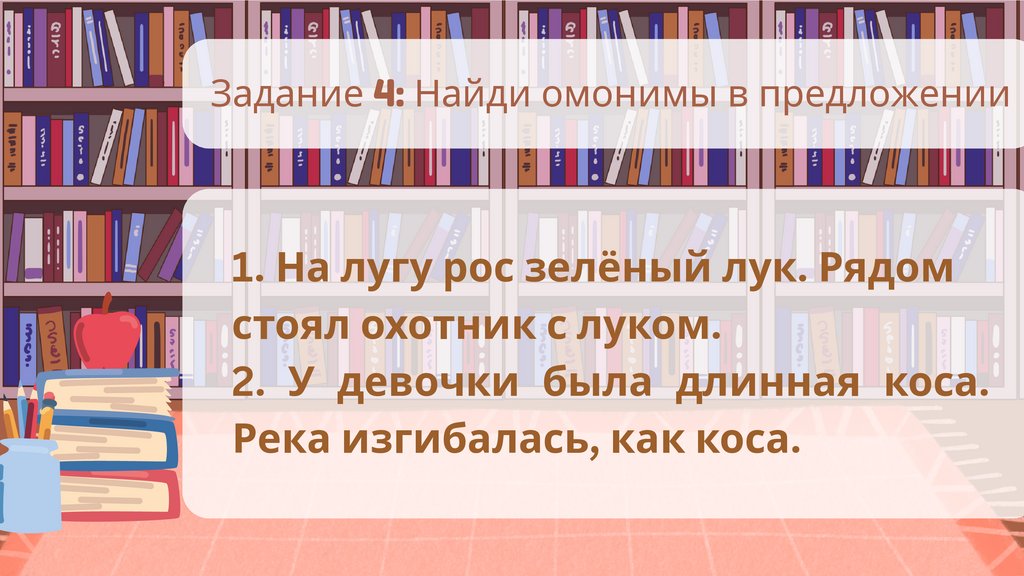 Задание 4: Найди омонимы в предложении1. На лугу рос зелёный лук. Рядом