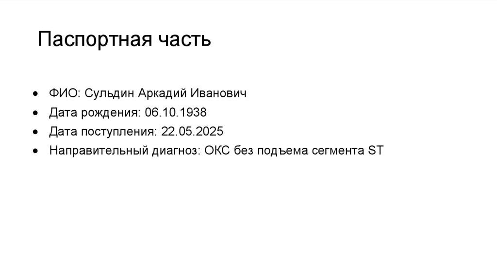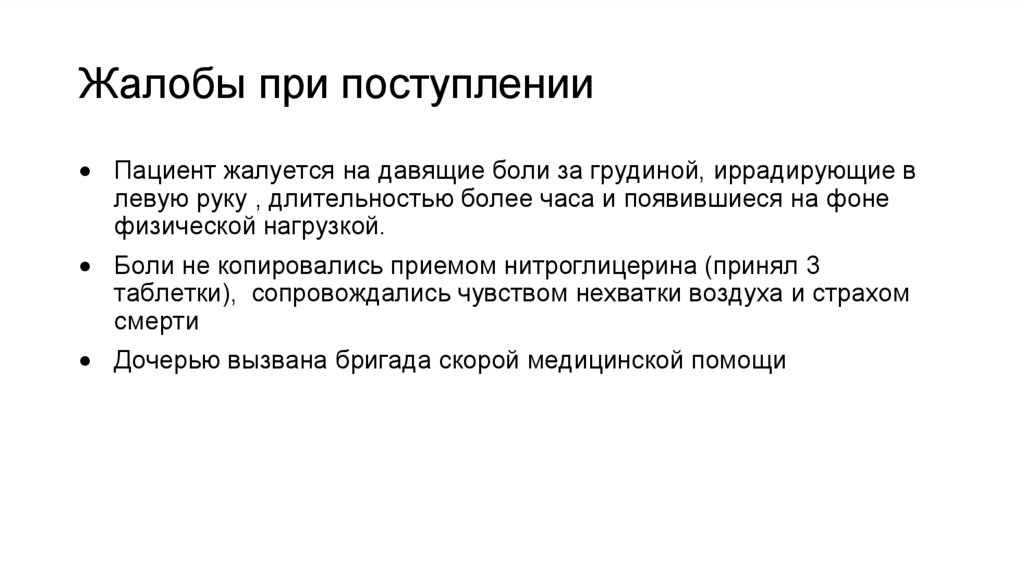 Жалобы при поступленииПациент жалуется на давящие боли за грудиной, иррадирующие в