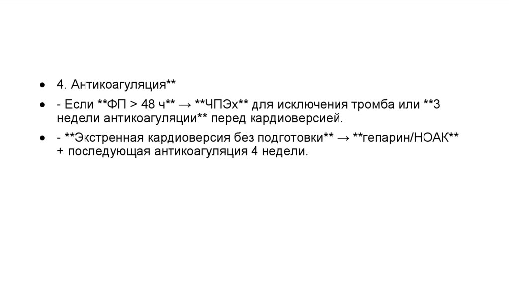 4. Антикоагуляция**- Если **ФП > 48 ч** → **ЧПЭх** для исключения тромба или **3