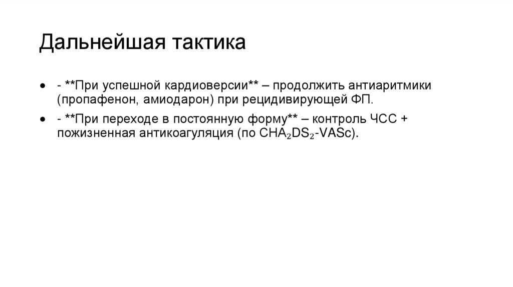 Дальнейшая тактика- **При успешной кардиоверсии** – продолжить антиаритмики