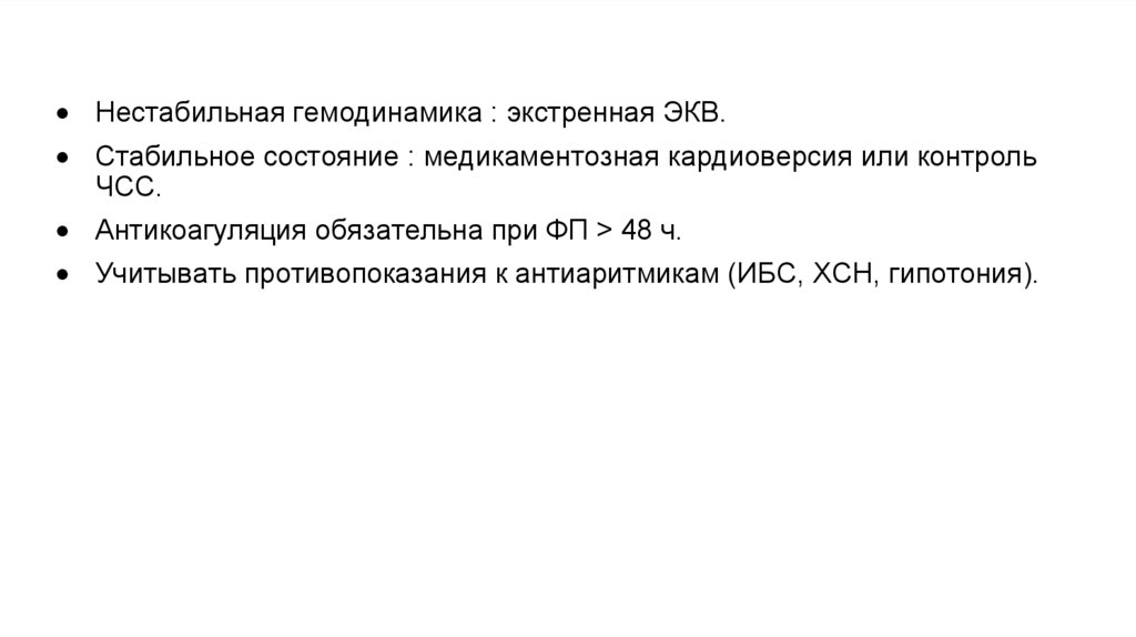 Нестабильная гемодинамика : экстренная ЭКВ.Стабильное состояние : медикаментозная кардиоверсия или контроль